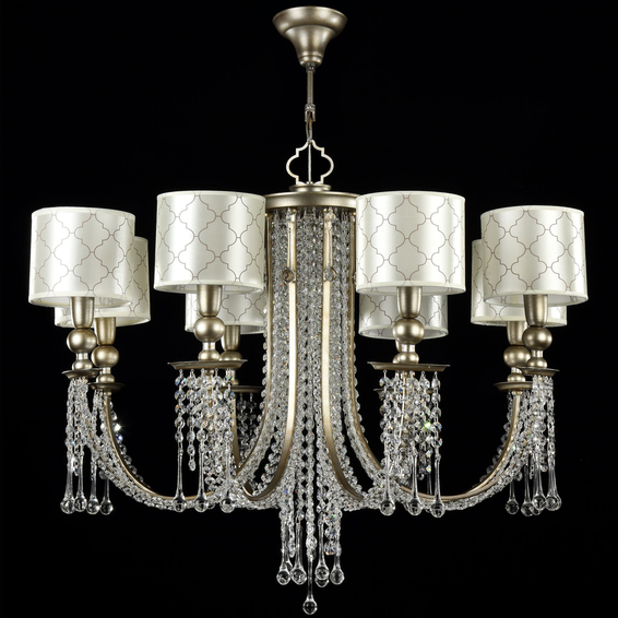 Арматура из металла. Абажур из ПВХ покрыт тканью с узором в стиле ар-деко. Подвески из *хрусталя.