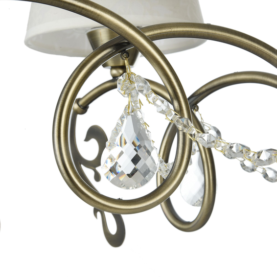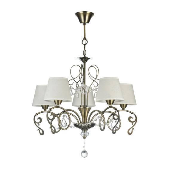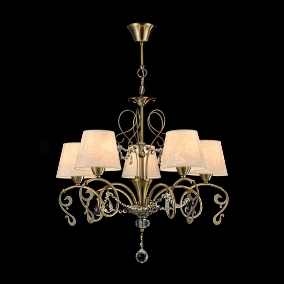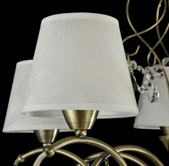 Арматура светильников выполнена из бронзы, абажуры — из ткани и ПВХ. Дизайн светильников с затейливо изогнутой арматурой и подвесками в форме шаров.
