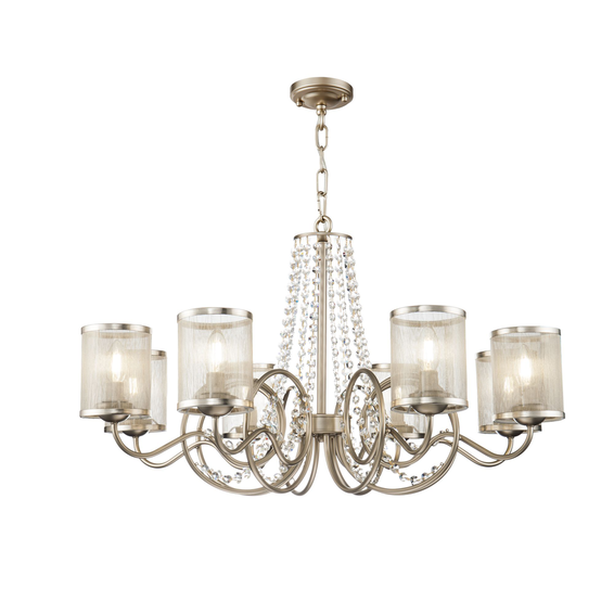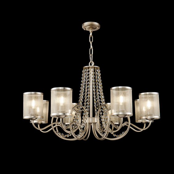 Металлическая арматура цвета матового золота оттеняет абажуры из золотистой органзы. Абажуры декорированы лентой, а арматура люстр — многочисленными подвесками.