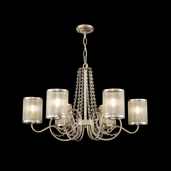 Металлическая арматура цвета матового золота оттеняет абажуры из золотистой органзы. Абажуры декорированы лентой, а арматура люстр — многочисленными подвесками.