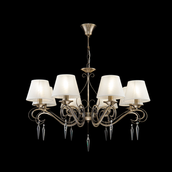 Абажуры сделаны из полупрозрачной ткани цвета «шампань», которая сочетается с цветом арматуры (бронза). Благодаря жаккардовому рисунку на абажурах создается иллюзия перламутра или легкой дымки. Светильники украшены изящными вытянутыми подвесками.