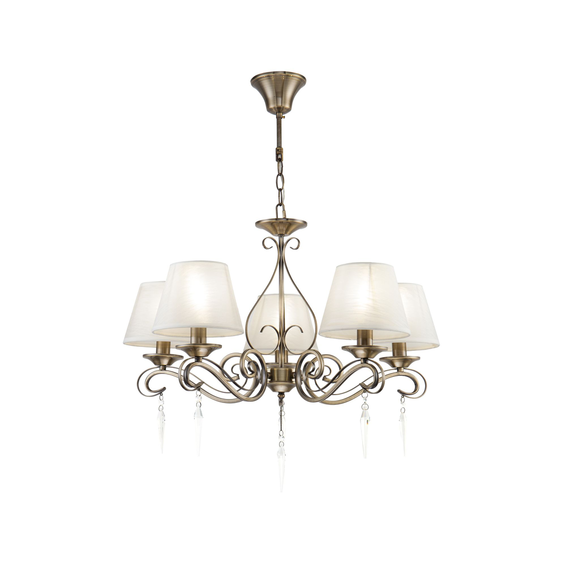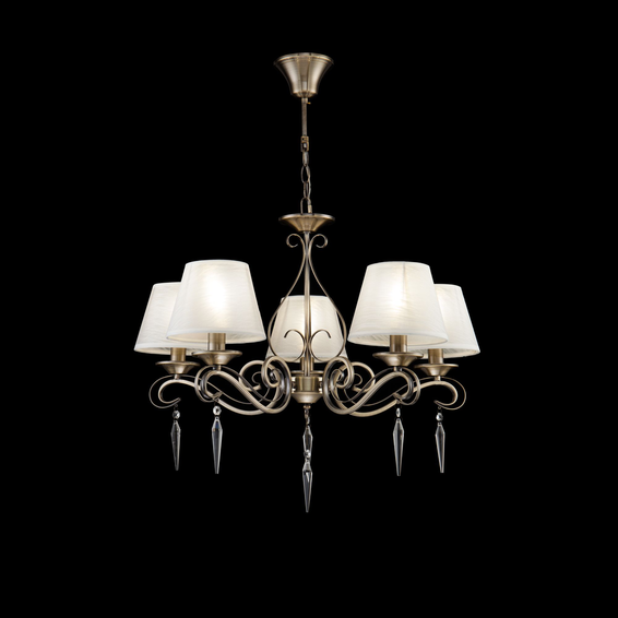 Абажуры сделаны из полупрозрачной ткани цвета «шампань», которая сочетается с цветом арматуры (бронза). Благодаря жаккардовому рисунку на абажурах создается иллюзия перламутра или легкой дымки. Светильники украшены изящными вытянутыми подвесками.