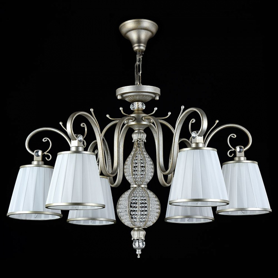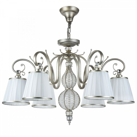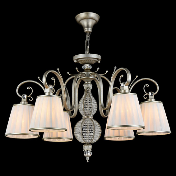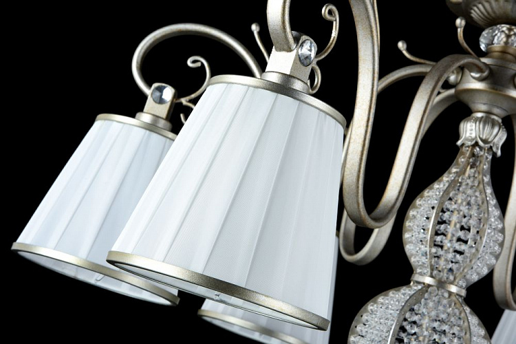 Арматура из металла. Центральная часть люстры декорирована бусинами. Абажуры из плотного плиссированного атласа.