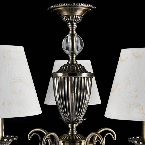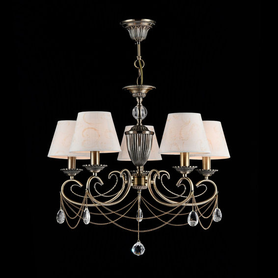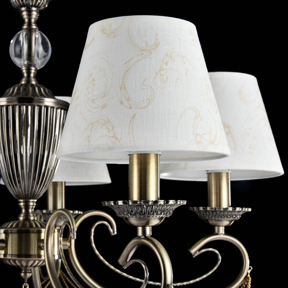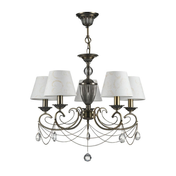 Арматура изделий сделана из металла и декорирована тонкими цепочками и подвесками. Абажуры светильников из хлопка с паттерном. В дизайне светильников можно встретить античные мотивы.