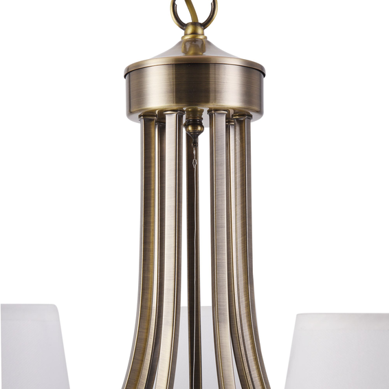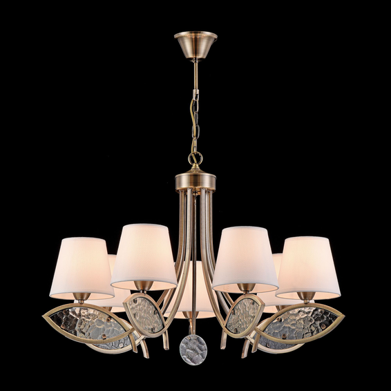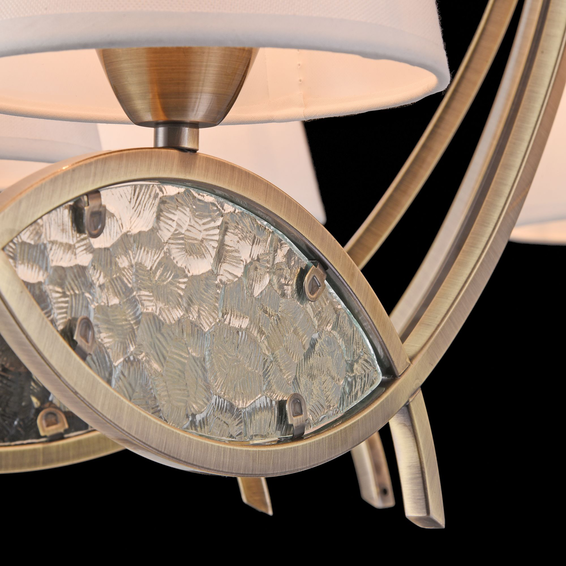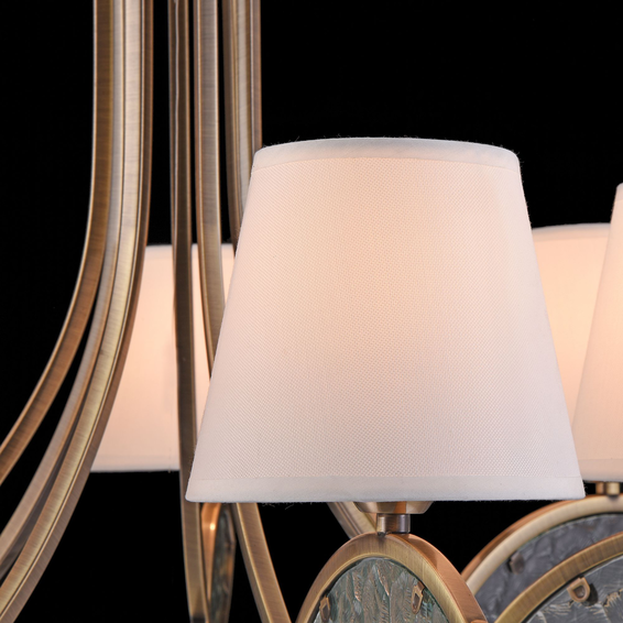 Арматура цвета античной бронзы украшена декоративными элементами и подвеской-кругом из витражного стекла. Абажуры сделаны из белого текстиля.