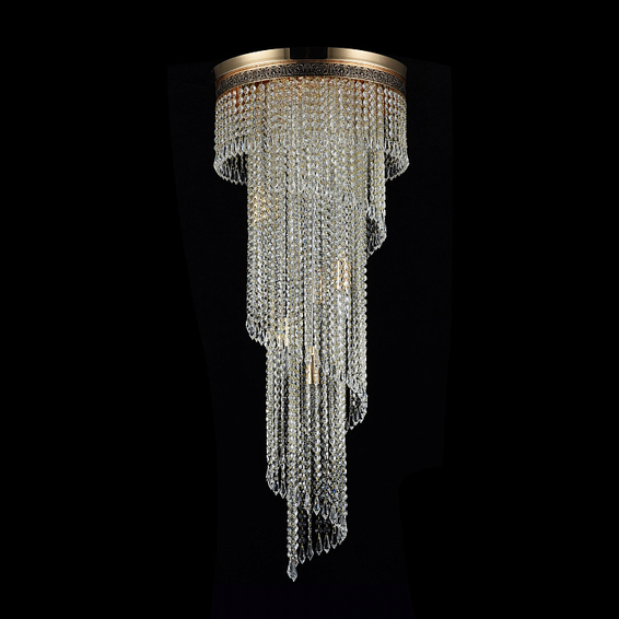 Круглый каркас из металла обрамлен латунной лентой. Подвески из хрусталя.