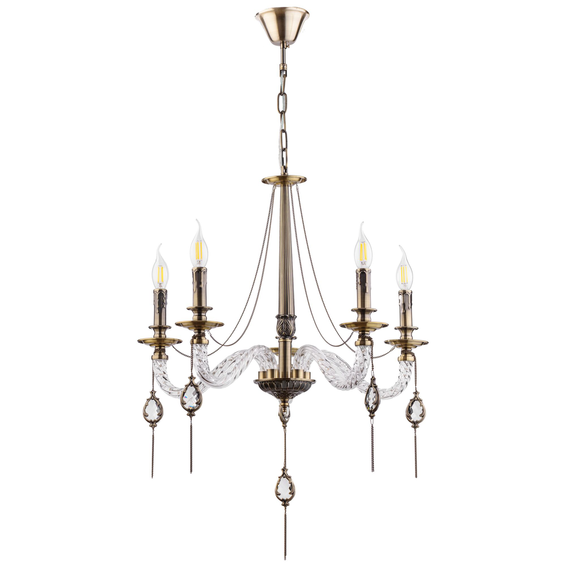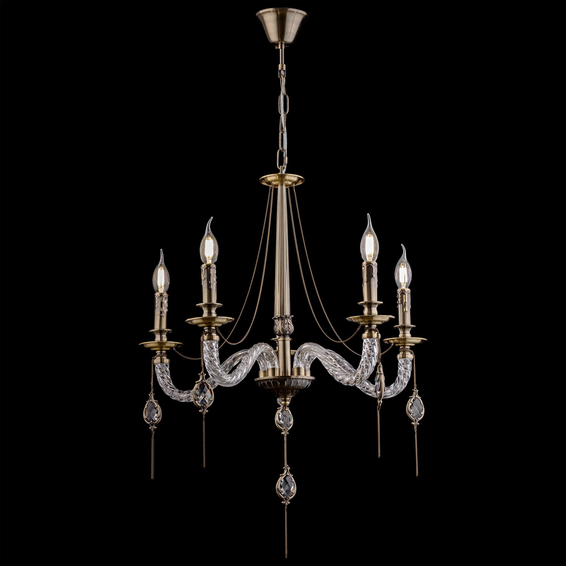 Арматура сделана из металла цвета античной бронзы и стекла. Светильники декорированы стеклянными подвесками.