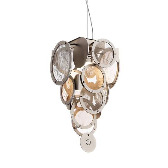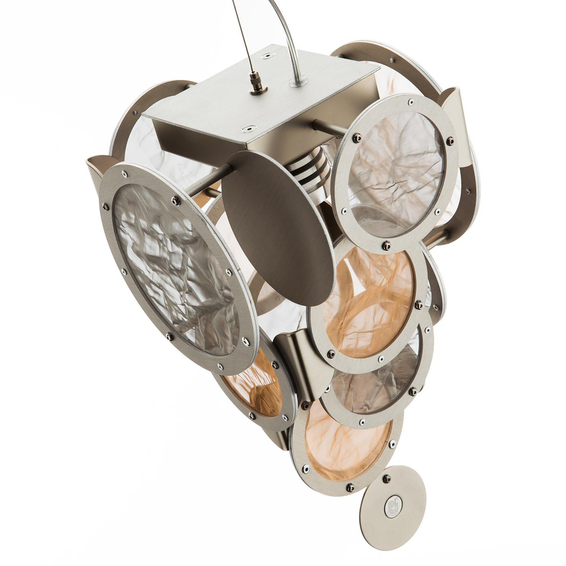 Арматура светильника сделана из металла. Металлическая рама доступна в разных цветах. Декоративные круги со стеклом прозрачного и медного цветов.