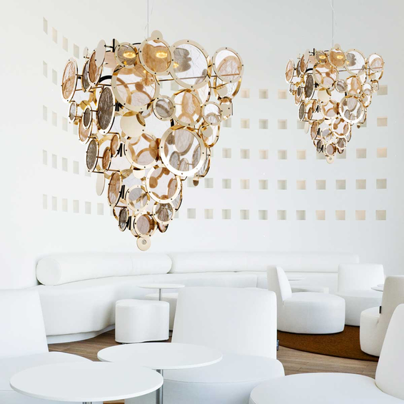 Арматура светильника сделана из металла. Металлическая рама доступна в: алюминий,светлое золото,черный никель,белый бархат,ржавчина. Декоративные круги со стеклом прозрачного и медного цветов.
