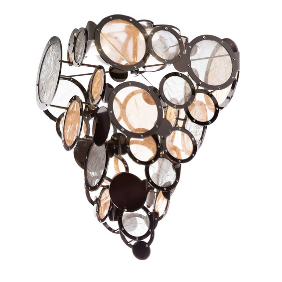 Арматура светильника сделана из металла. Металлическая рама доступна в: алюминий,светлое золото,черный никель,белый бархат,ржавчина. Декоративные круги со стеклом прозрачного и медного цветов.