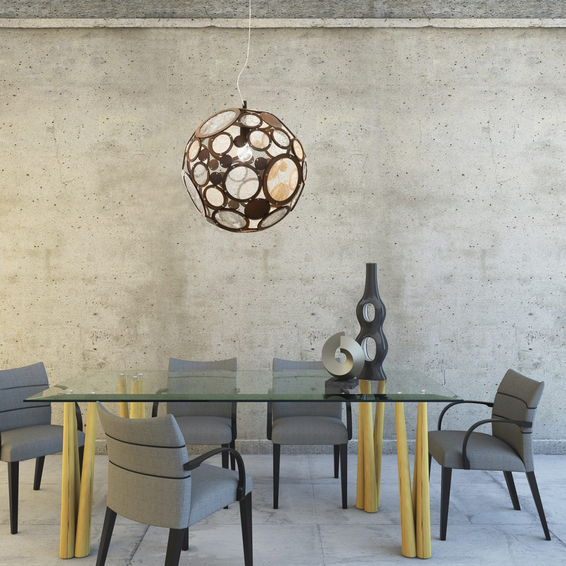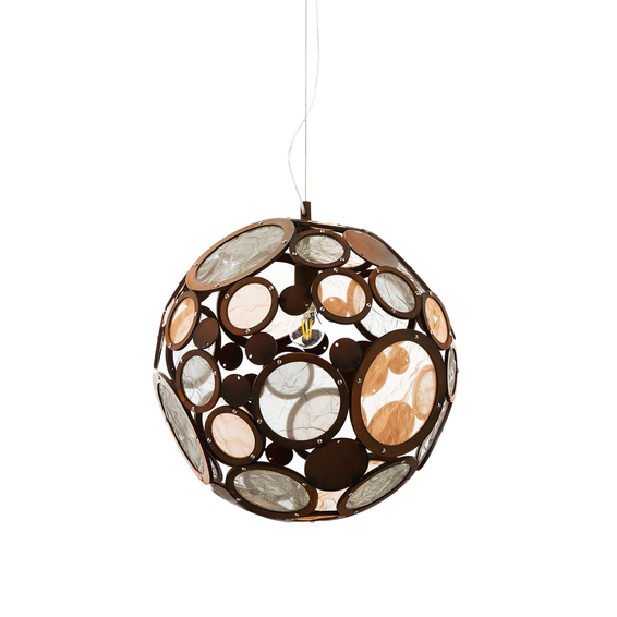 Арматура светильника сделана из металла. Металлическая рама доступна в разных цветах. Декоративные круги со стеклом прозрачного и медного цветов.