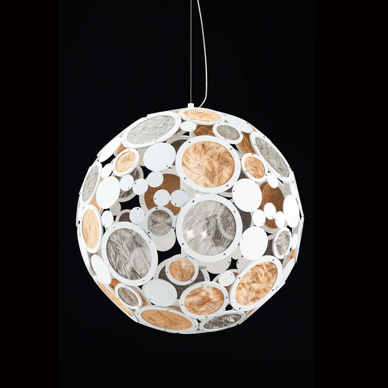 Арматура светильника сделана из металла. Металлическая рама доступна в разных цветах. Декоративные круги со стеклом прозрачного и медного цветов.