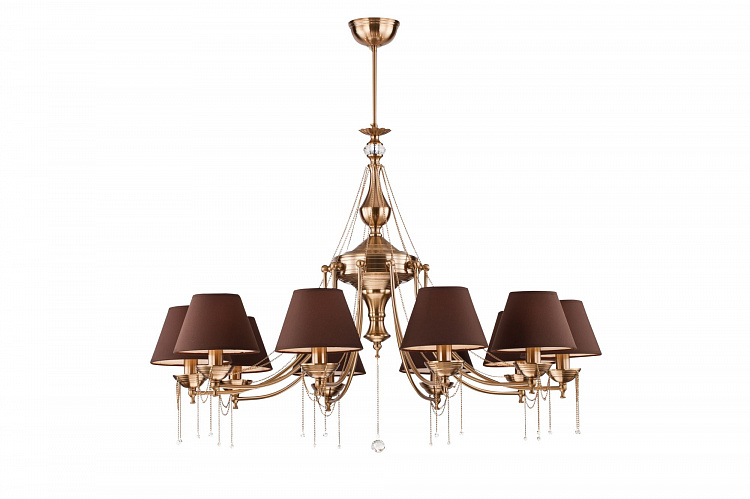 Арматура из металла. Абажур из ПВХ покрыт коричневой тканью. Искусственный жемчуг в подвесках.