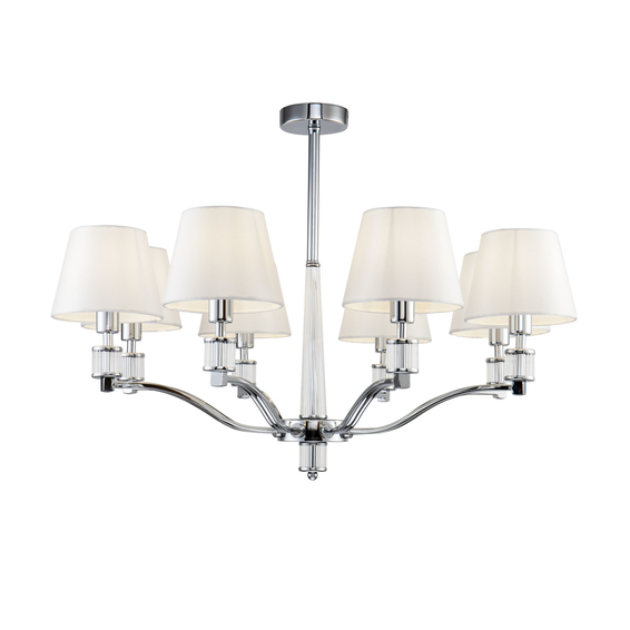 Дизайн арматуры дополнен декоративными элементами из прозрачного стекла. Абажуры сделаны из белой атласной ткани.