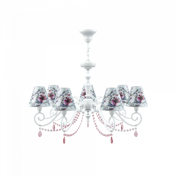 Арматура из металла, плафон текстиль на ПВХ, направлен вверх, хрустальные подвески красного цвета. Есть идентичная модель, хрусталь серого цвета ( артикул E3-07-WM-LMP-O-13-CRL-E3-07-GR-UP)