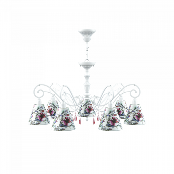 Арматура из металла, плафон текстиль на ПВХ, направлен вниз, хрустальные подвески красного цвета. Есть идентичная модель, хрусталь серого цвета ( артикул E3-07-WM-LMP-O-13-CRL-E3-07-GR-DN)