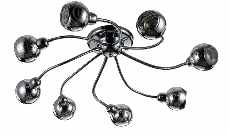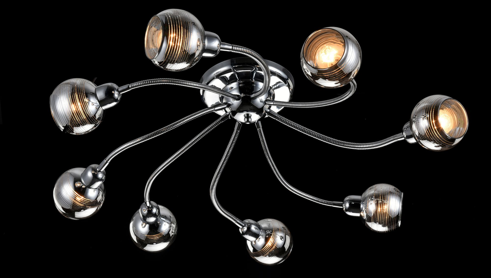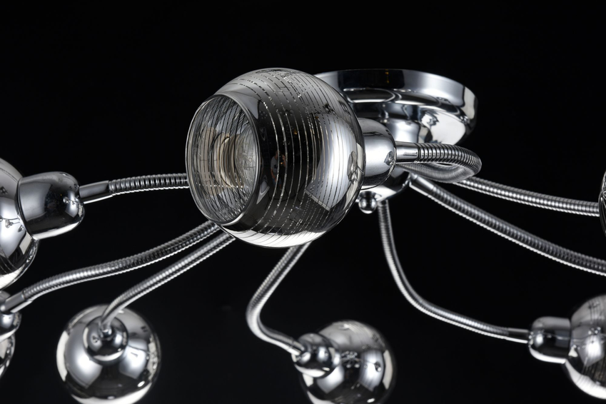 Каркас из металла цвета «хром», с декоративным элементом в виде узла и с круглыми плафонами из стекла, окрашенного под металл с орнаментом из тонких полос.