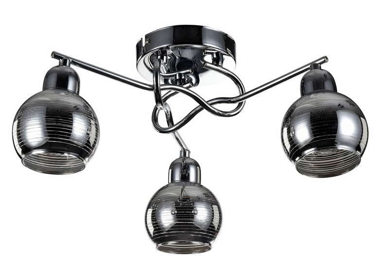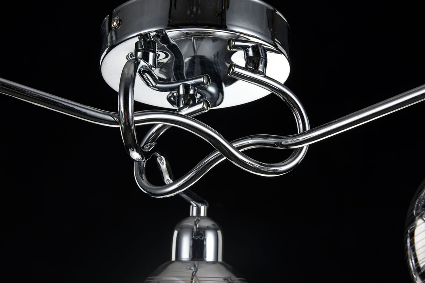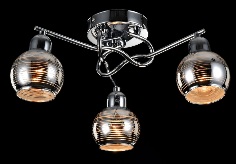 Каркас из металла цвета «хром», с декоративным элементом в виде узла и с круглыми плафонами из стекла, окрашенного под металл с орнаментом из тонких полос.
