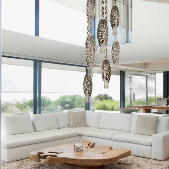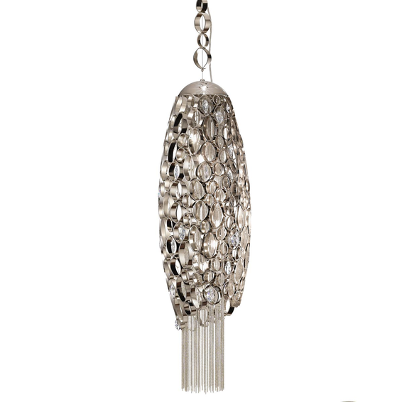 Каркас изготовлен из металла, декоративные элементы - кристаллы Сваровски и подвесные цепочки из никеля. Доступен в следующих цветовых вариантах отделки: светлое золото, чистая сталь, полированная слоновая кость, черный баклажан, черный никель. Доступна с восемью лампами G9.