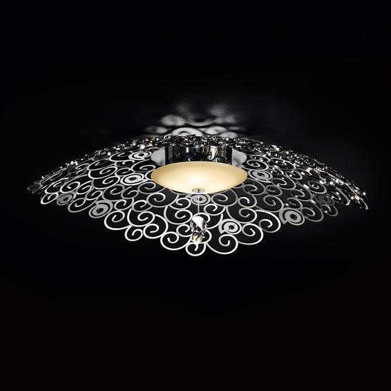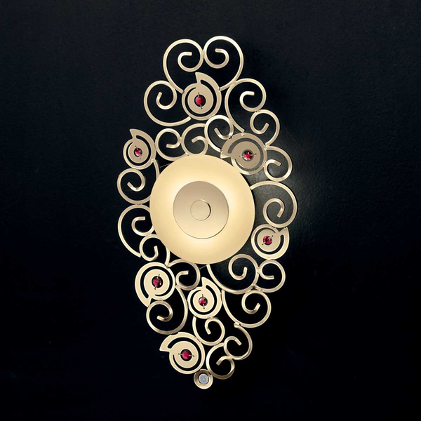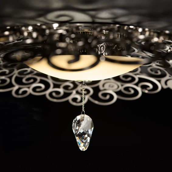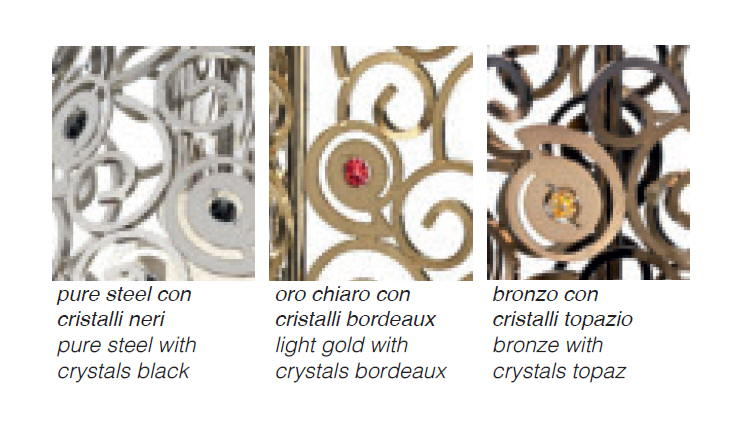 Каркас изготовлен из металла, в виде ажурной сетки, с декоративными элементами Swarowski Crystals. Доступен в следующих сочетаниях: хром и черные подвески, светлое золото и красные подвески, бронза и янтарные подвески.