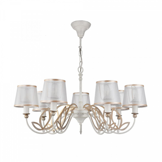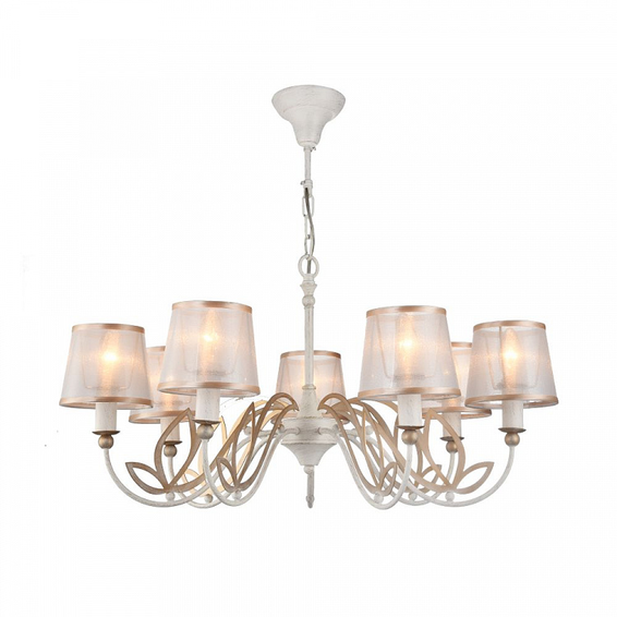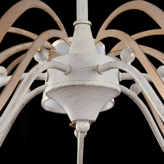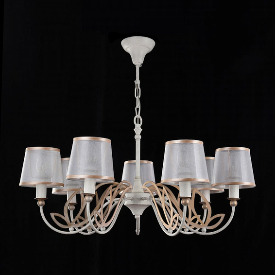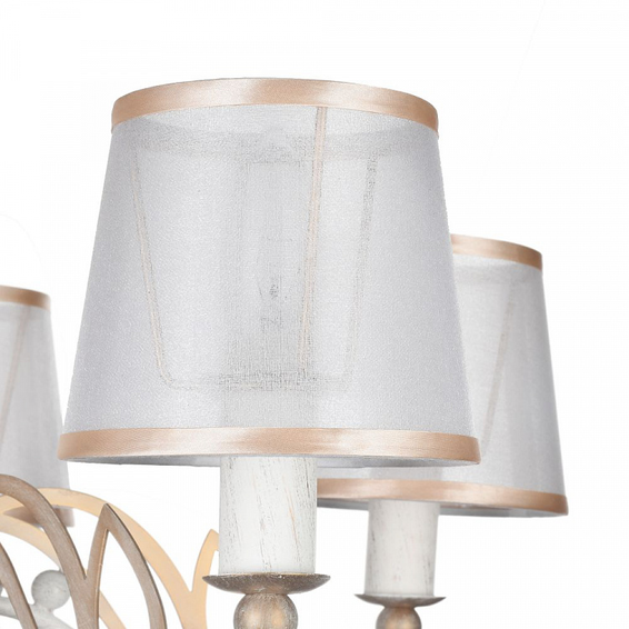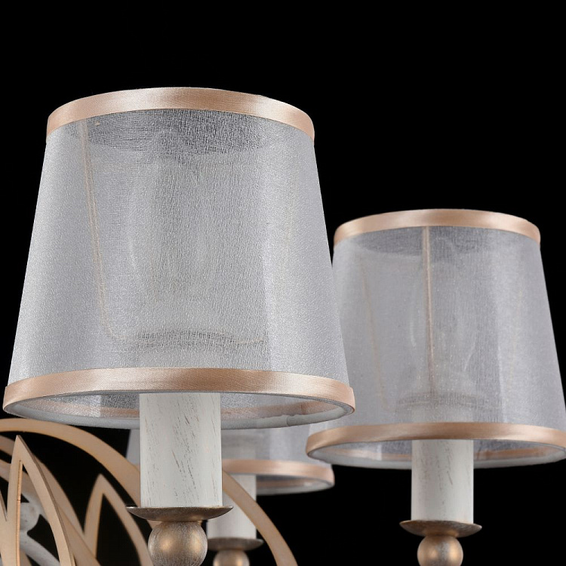 Арматура из металла. Рожки украшены декоративными элементами. Абажур из ПВХ покрыт прозрачной органзой.