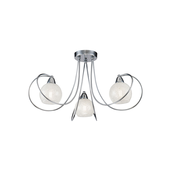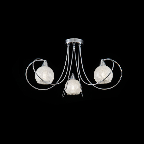 Изгибы металлической арматуры повторяют форму плафонов, сделанных из прозрачного стекла с эффектом заморозки (внутри плафоны обсыпаны кристаллами).