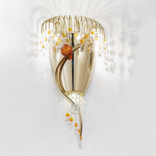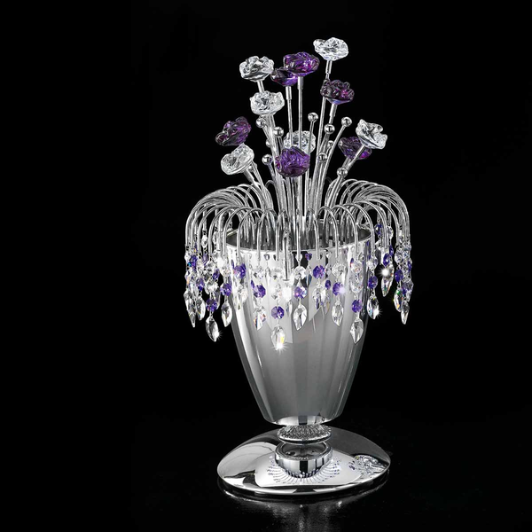 Каркас изготовлен из металла, декоративные элементы из прозрачного, фиолетового, янтарного стекла, с кристалами Swarovski. Доступен в в цвете светлое золото и хром.