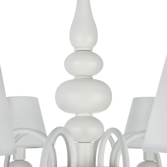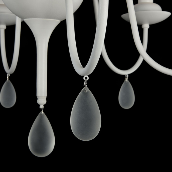 Акцент в данной серии сделан на белый цвет, в котором выполнена арматура, абажуры, сделанные из ткани на ПВХ, и каплевидные подвески из матового стекла