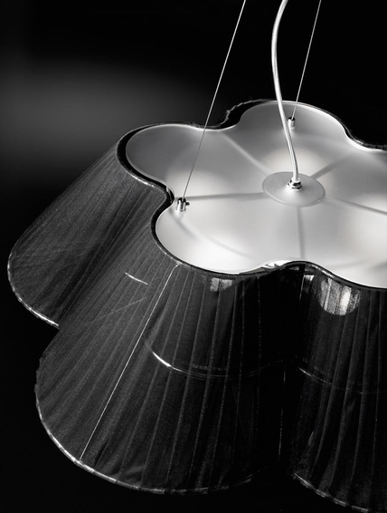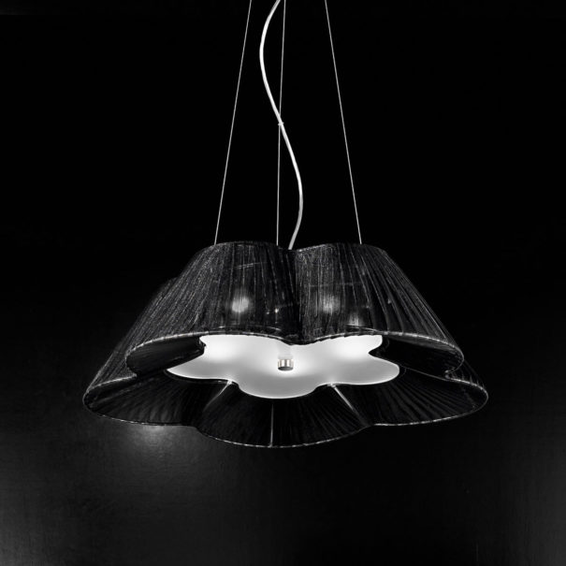 Хромированная металлическая рама. Абажур из хромированного металла, покрытый органзой, доступен в следующих цветах:черная органза,ледяная органза,янтарная органза. Рассеиватель из сатинированного поликарбоната.