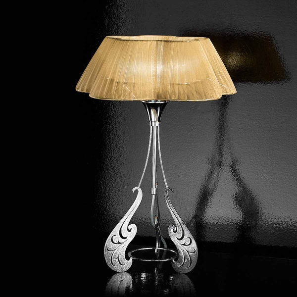 Хромированная металлическая рама. Абажур из хромированного металла, покрытый органзой, доступен в следующих цветах.