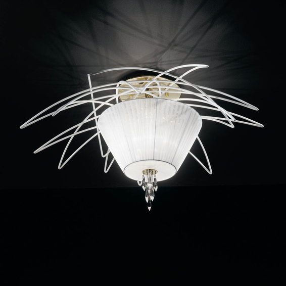 Металлический каркас доступен в разных цветах: бархатное белое и светлое золото,бархатный белый и матовый никель,намибия и матовый никель, намибия и светлое золото,медная и чистая сталь. Коллекция доступна с белым или коричневым абажуром из органзы (код 524). Прозрачные хрустальные подвески.