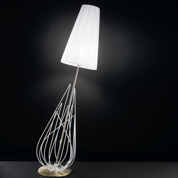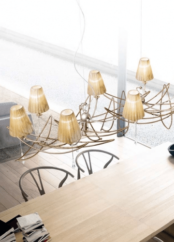 Металлический каркас доступен в разных цветах: бархатное белое и светлое золото,бархатный белый и матовый никель,намибия и матовый никель, намибия и светлое золото,медная и чистая сталь. Коллекция доступна с прозрачным диффузором из стекла Pyrex (код 525) или с белым или коричневым абажуром из органзы (код 524). Прозрачные хрустальные подвески.