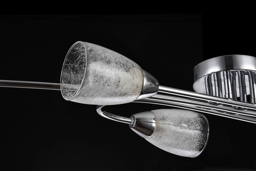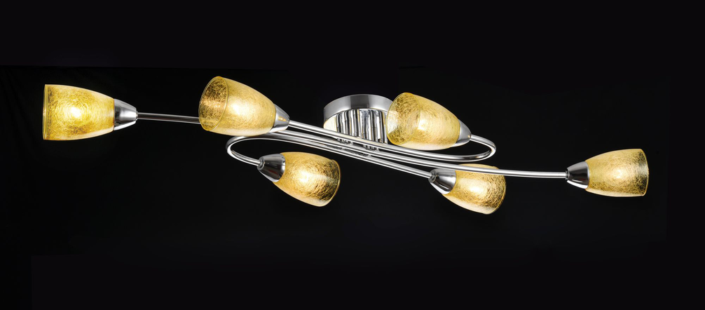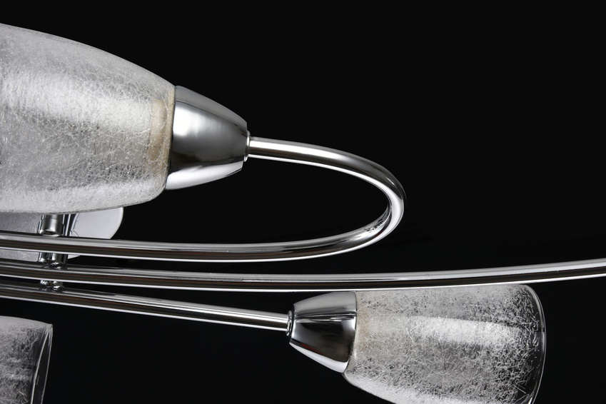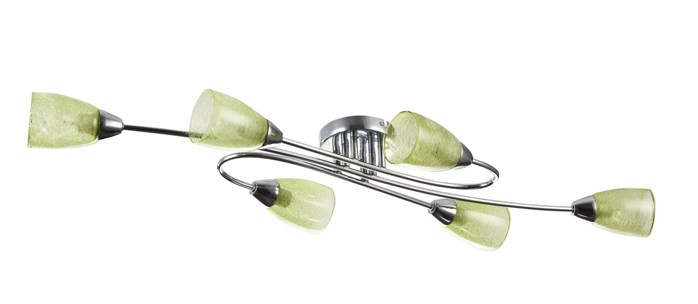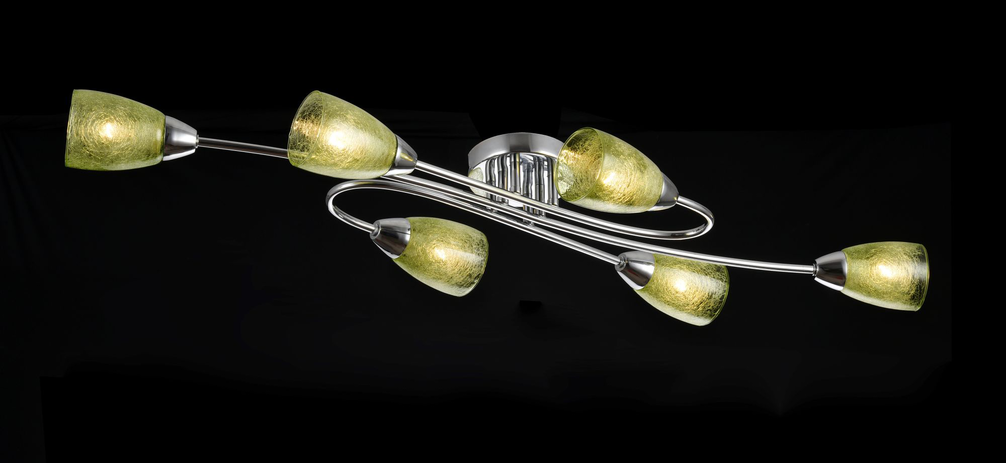 Арматура светильников выполнена из металла цвета «хром», плафоны — из стекла в зеленом, жёлтом и белом цвете.