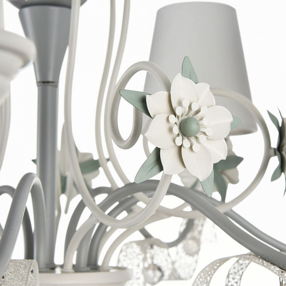 Арматура из металла. Множество декоративных элементов: ажурные ленты, цветы; основание серого цвета. Абажур из ПВХ покрыт белой тканью.