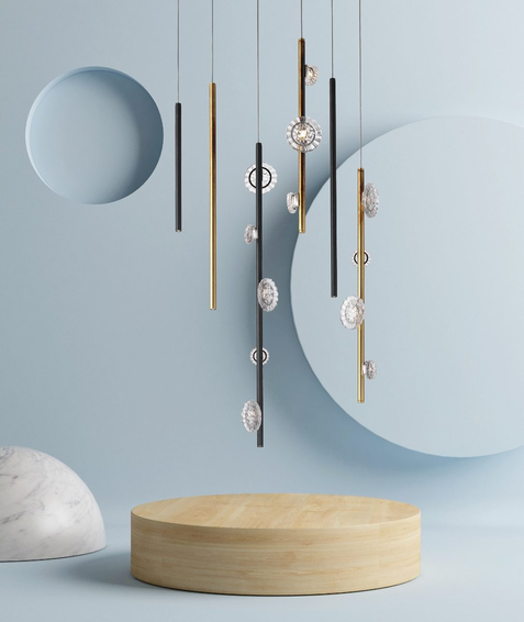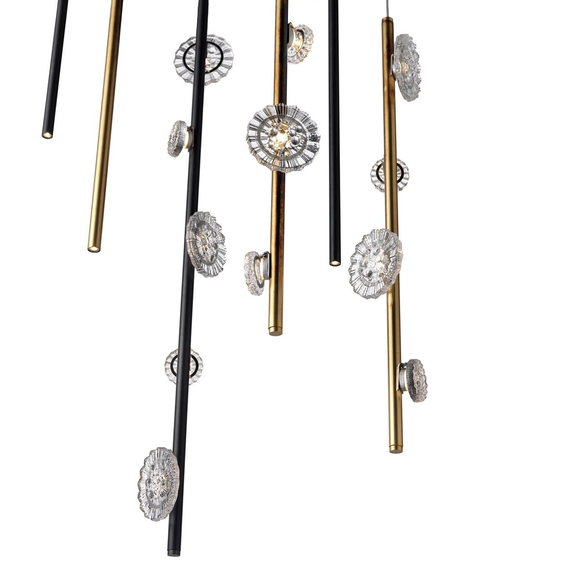 Каркас изготовлен из металла, диффузор прозрачный выполнен из муранского стекла. Доступен в следующих цветах: стальной, полированный кортен, матовое античное золото, светлое золото.