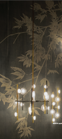 Каркас изготовлен из металла, диффузор прозрачный выполнен из муранского стекла. Доступен в следующих цветах: стальной, полированный кортен, матовое античное золото, светлое золото.