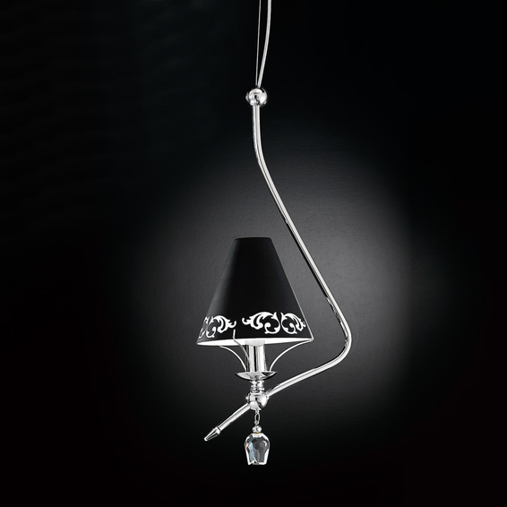 Металлический каркас доступен в разных цветах:24-каратное золото с матовыми деталями,хром с матовыми хромированными деталями. Плафон из стекла,с ручной отделкой черного цвета и белого. Подвеска из прозрачного хрусталя.