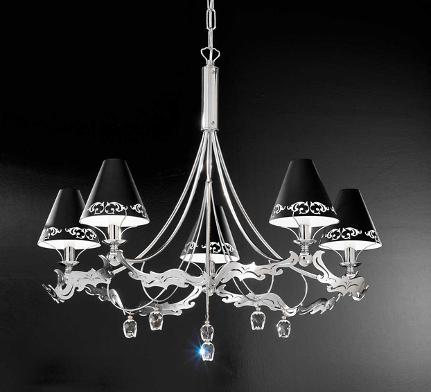 Металлический каркас доступен в разных цветах:24-каратное золото с матовыми деталями,хром с матовыми хромированными деталями. Плафон из стекла,с ручной отделкой черного цвета и белого. Подвеска из прозрачного хрусталя.