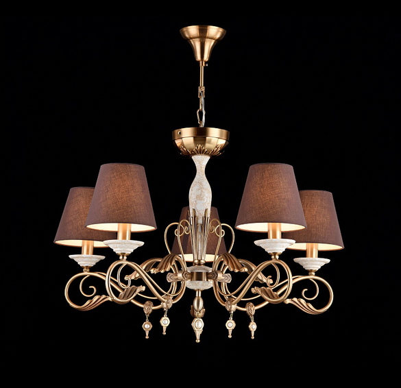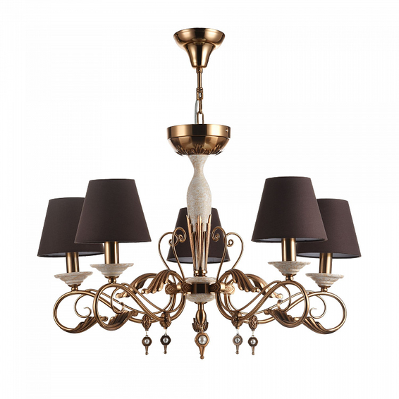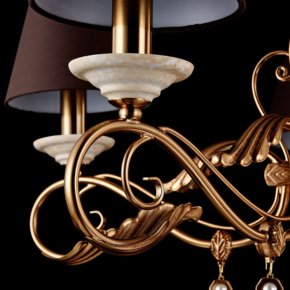 Арматура из металла. Абажур из ПВХ покрыт коричневой тканью. Искусственный жемчуг в подвесках.