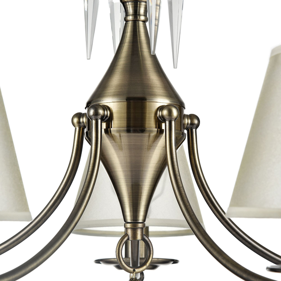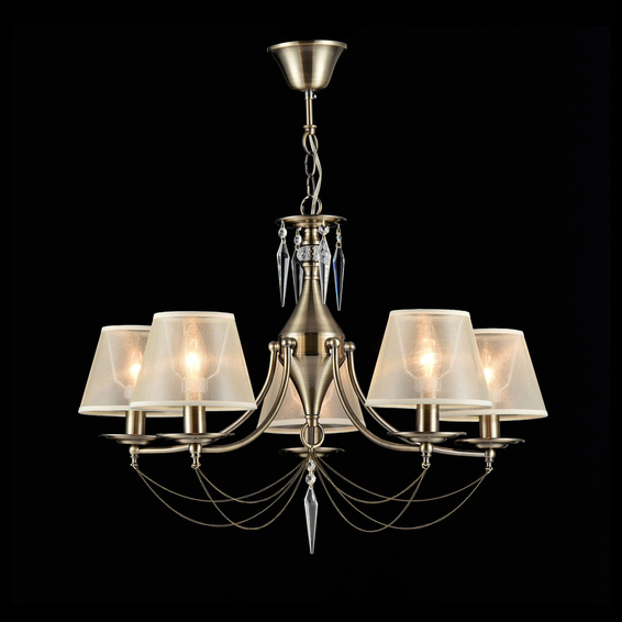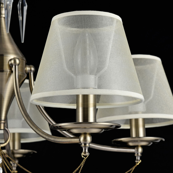 Абажуры светильников – из светлой органзы и хлопка, а арматура – из металла бронзового цвета. Дизайн изделий дополнен тонкими декоративными цепочками и изящными кристаллами.
