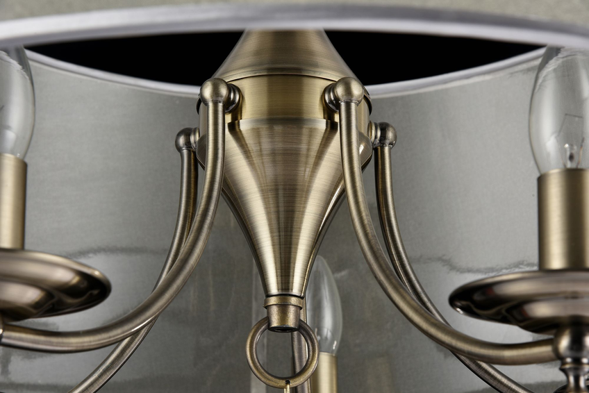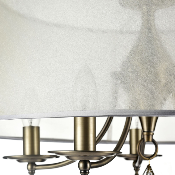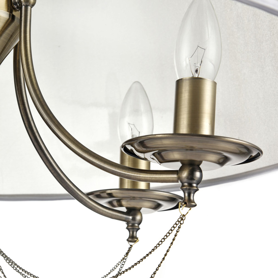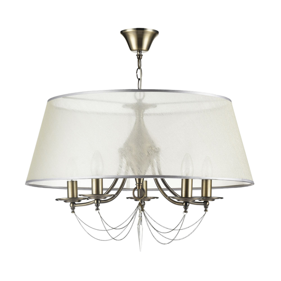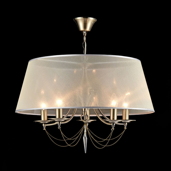 Абажуры светильников – из светлой органзы и хлопка, а арматура – из металла бронзового цвета. Дизайн изделий дополнен тонкими декоративными цепочками и изящными кристаллами.