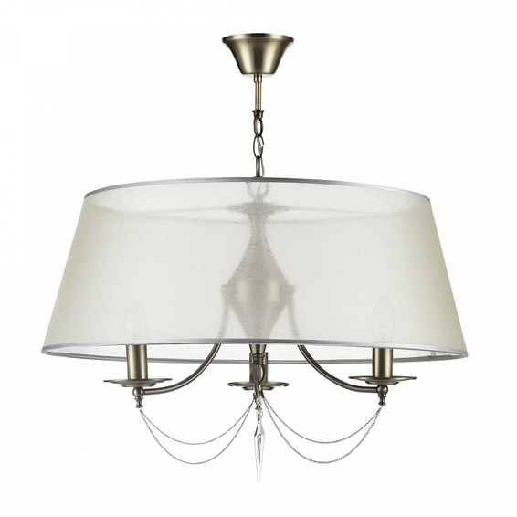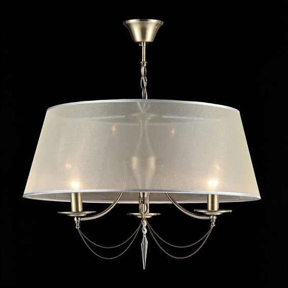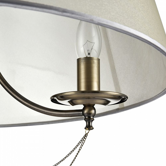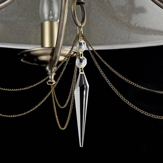 Абажуры светильников – из светлой органзы и хлопка, а арматура – из металла бронзового цвета. Дизайн изделий дополнен тонкими декоративными цепочками и изящными кристаллами.