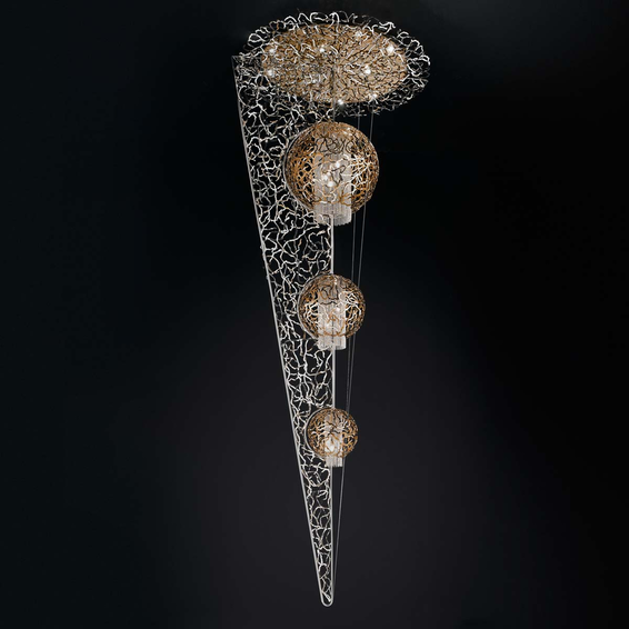 Каркас изготовлен из металла, декоративные элементы и подвески из кристаллов Swarovski. Доступен в следующих цветовых сочетаниях: белый матовый и светлое золото или сталь; черный матовый и светлое золото или сталь; черная фольга и светдлое золото или сталь; светлое золото; сталь.