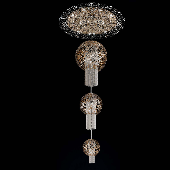 Каркас изготовлен из металла, декоративные элементы и подвески из кристаллов Swarovski. Доступен в следующих цветовых сочетаниях: белый матовый и светлое золото или сталь; черный матовый и светлое золото или сталь; черная фольга и светдлое золото или сталь; светлое золото; сталь.