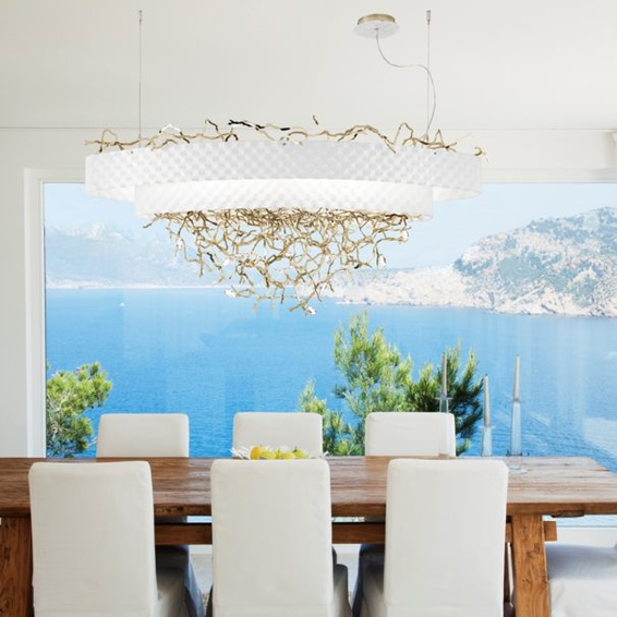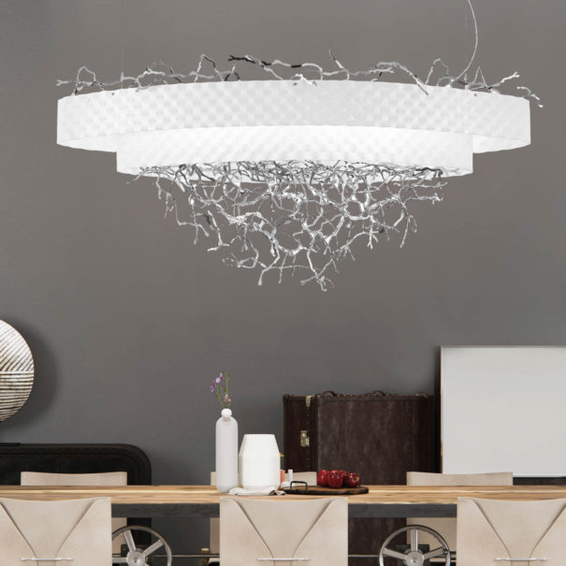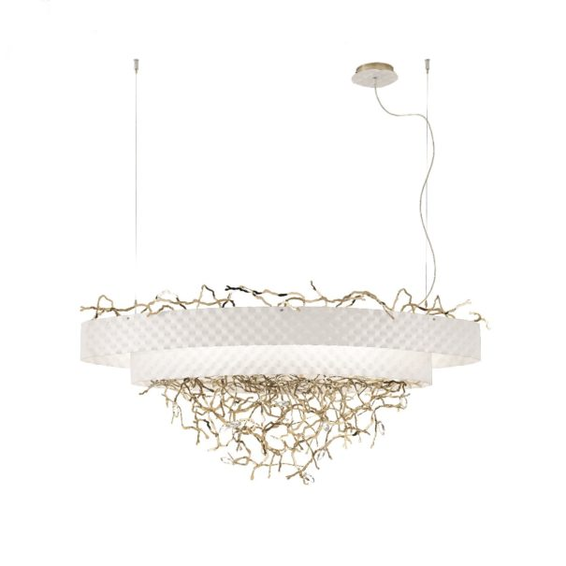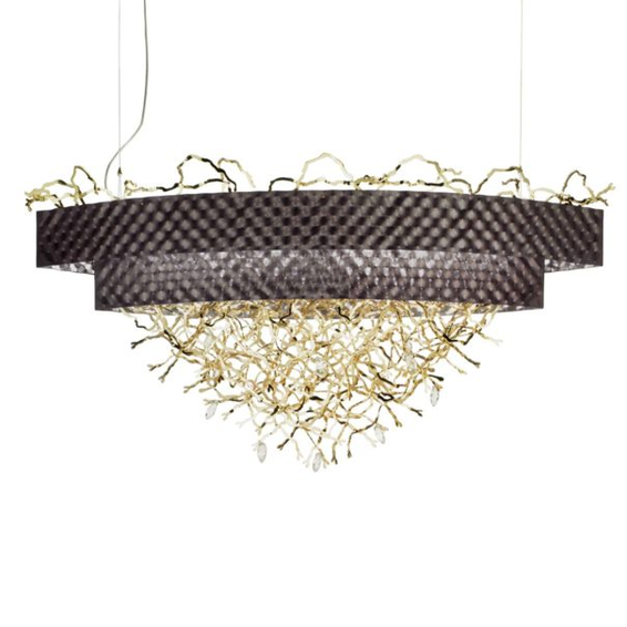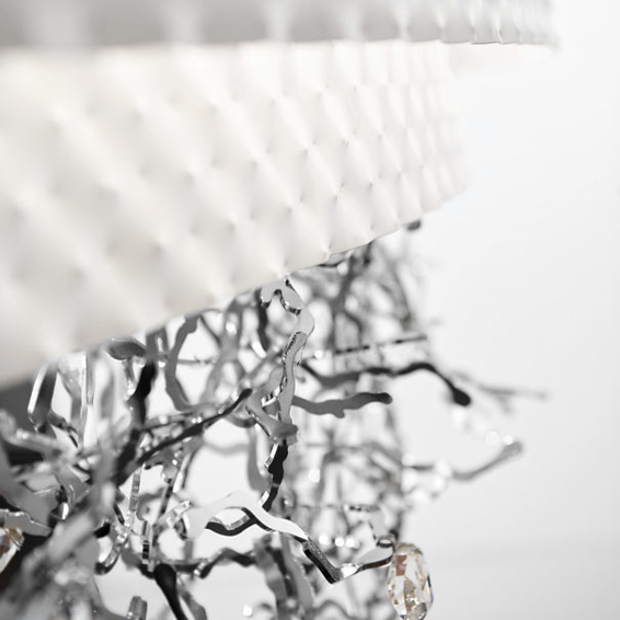 Каркас изготовлен из металла, декоративные элементы и подвески из кристаллов Swarovski. Доступен в следующих цветовых сочетаниях: белый матовый и светлое золото или сталь; черный матовый и светлое золото или сталь; черная фольга и светдлое золото или сталь; светлое золото; сталь.