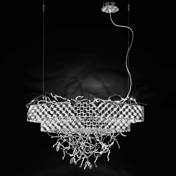 Каркас изготовлен из металла, декоративные элементы и подвески из кристаллов Swarovski. Доступен в следующих цветовых сочетаниях: белый матовый и светлое золото или сталь; черный матовый и светлое золото или сталь; черная фольга и светлое золото или сталь; светлое золото; сталь.