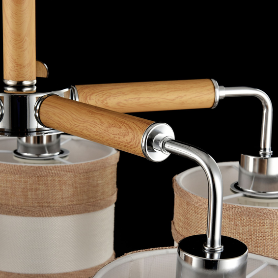 Двухцветные абажуры, сделанные из мешковины, сочетаются с древесной арматурой.