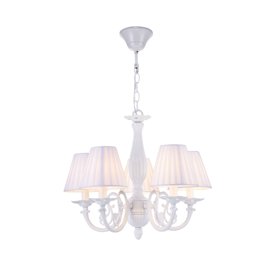Рожки украшены резным флористическим орнаментом, абажуры сделаны из белой полупрозрачной плиссированной ткани. Светильники серии подходят практически для любых помещений: от кухни до гостиной или спальни.