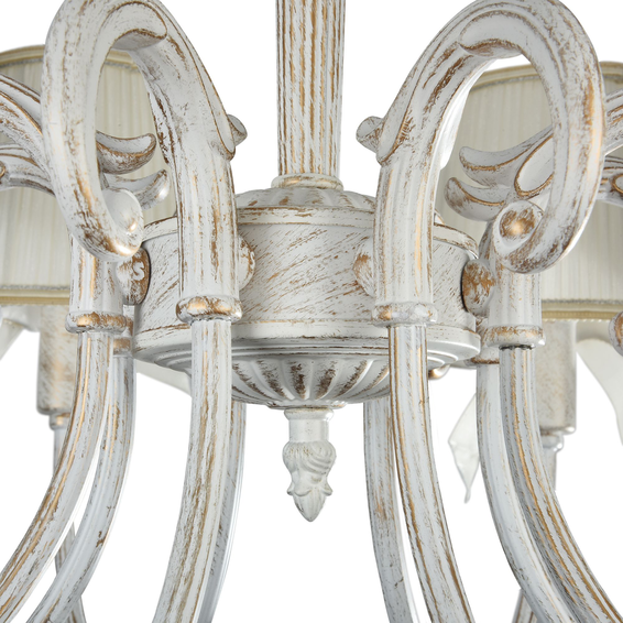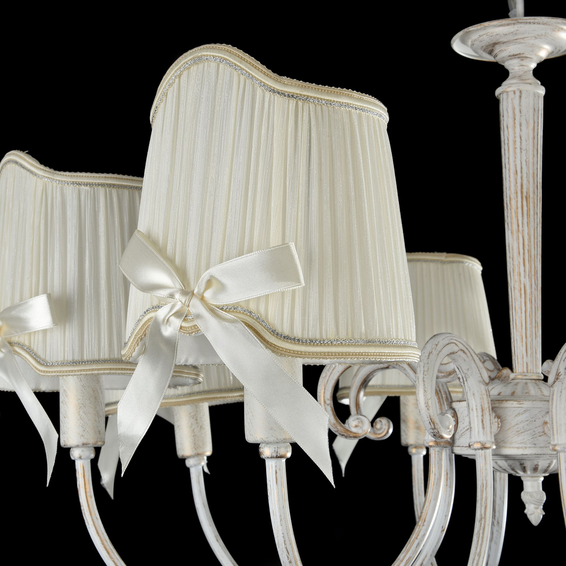 Арматура сделана из металла. Абажуры — из гофрированной ткани кремового цвета. Абажуры декорированы золотистой тесьмой и украшены атласными бантами.