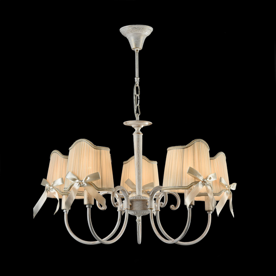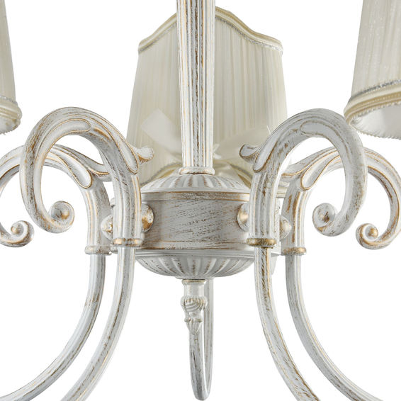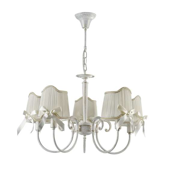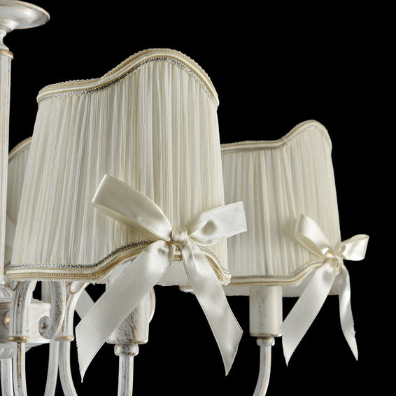 Арматура сделана из металла. Абажуры — из гофрированной ткани кремового цвета. Абажуры декорированы золотистой тесьмой и украшены атласными бантами.
